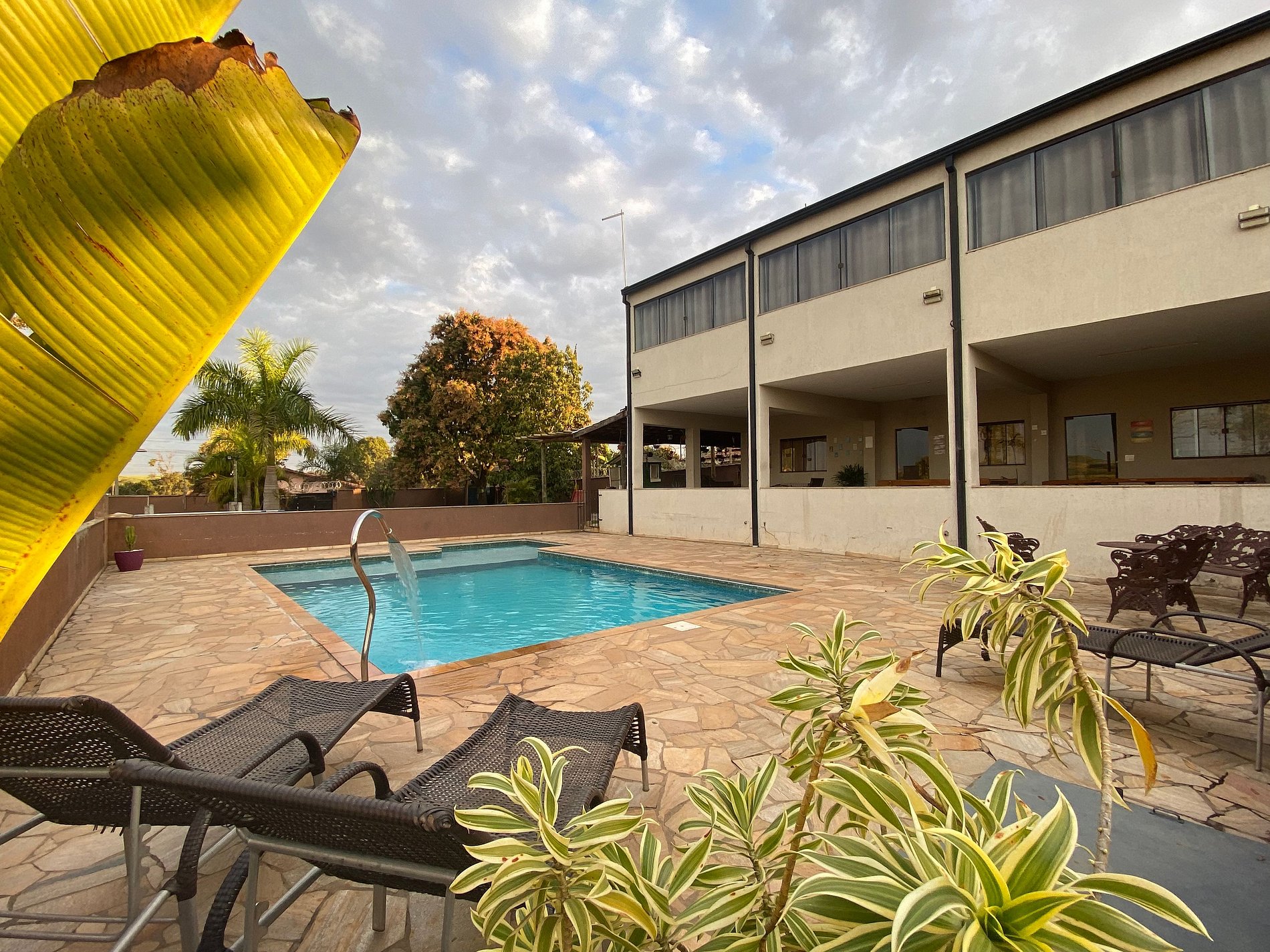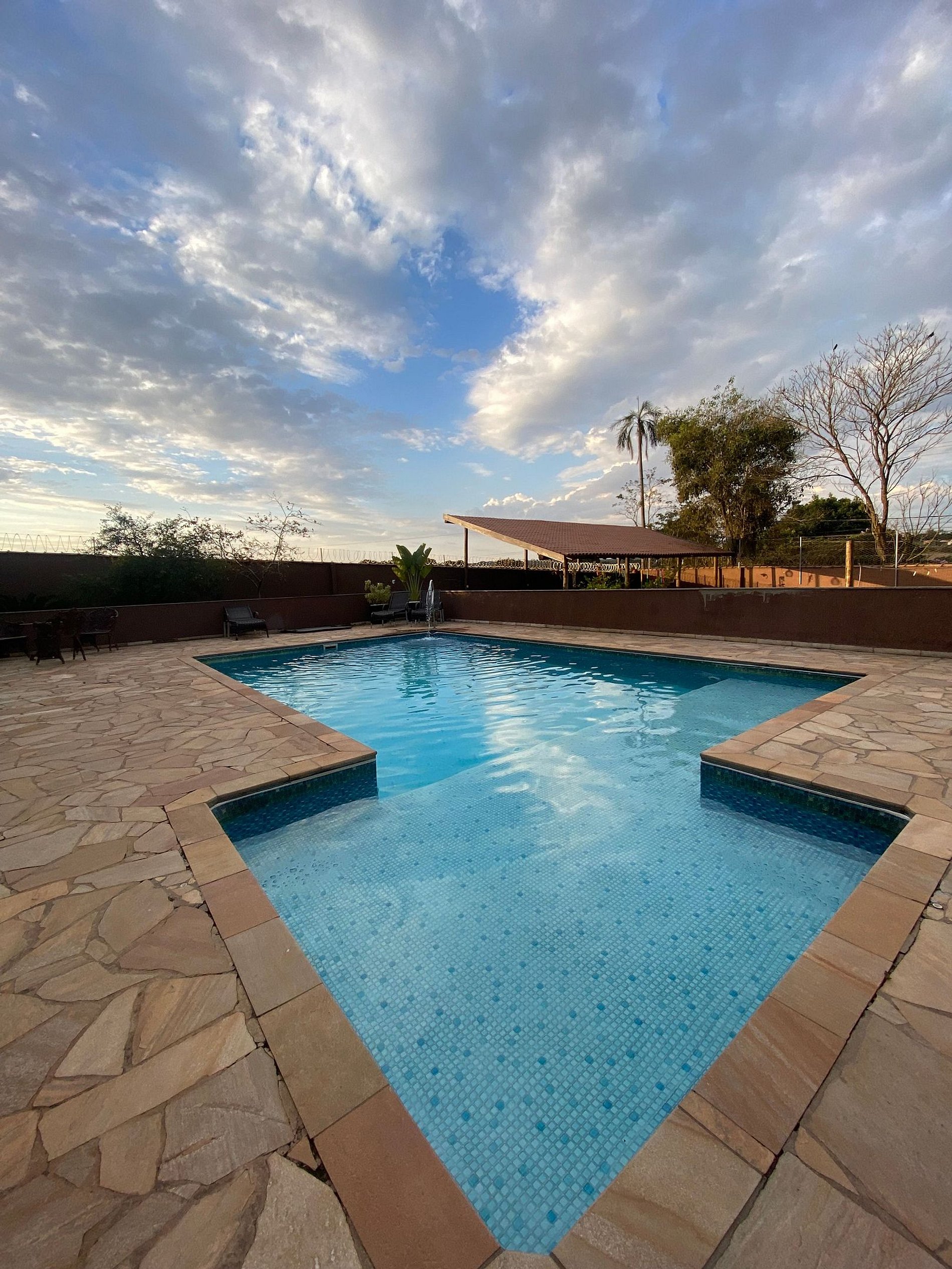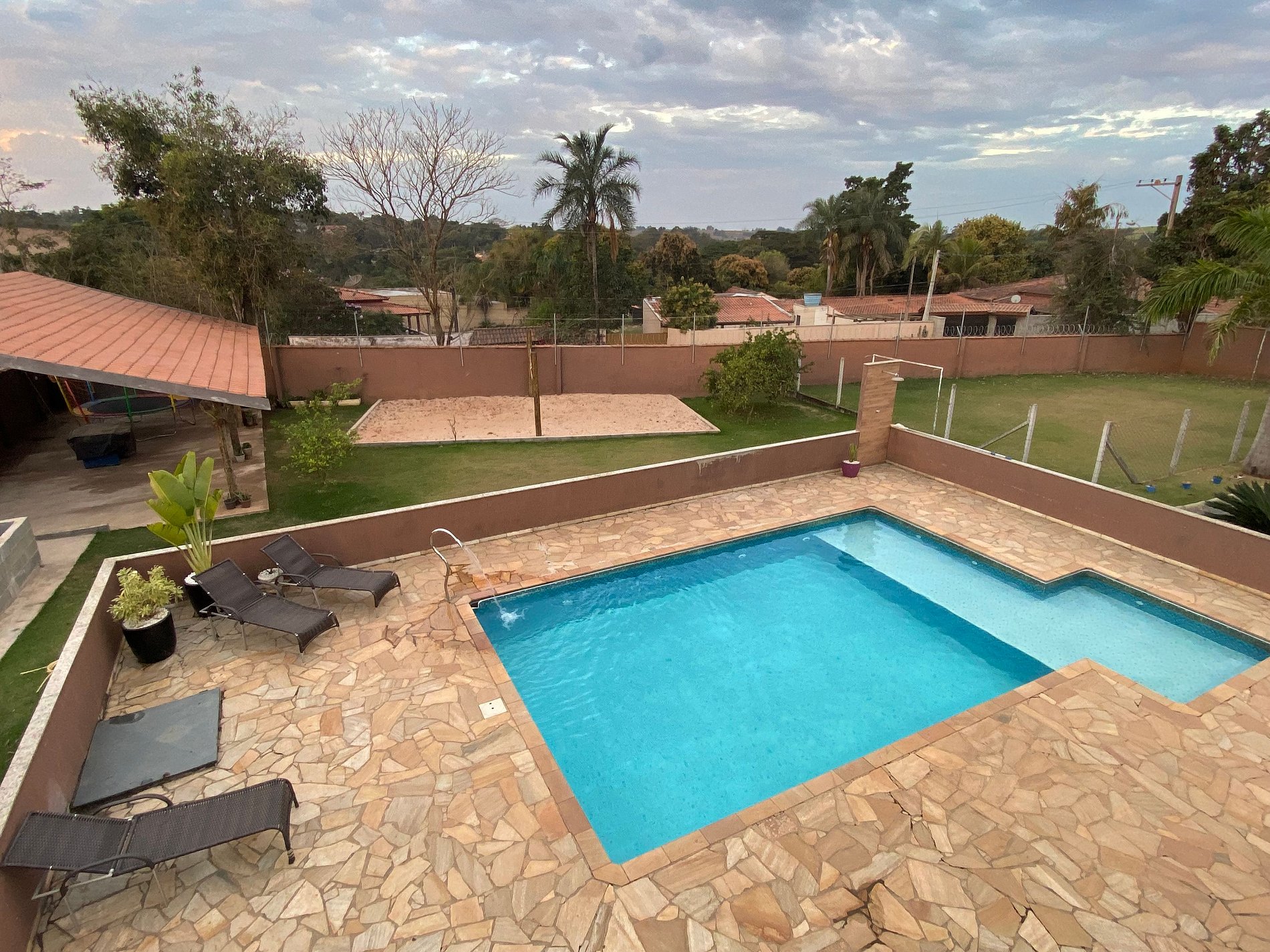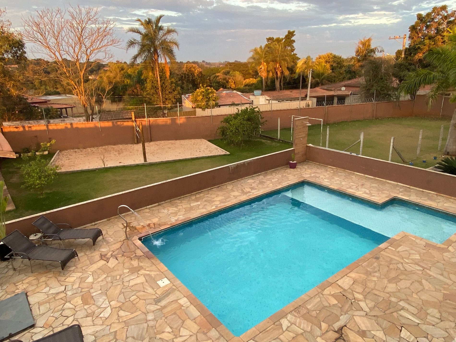 Piscina com parte rasa e espreguiçadeiras