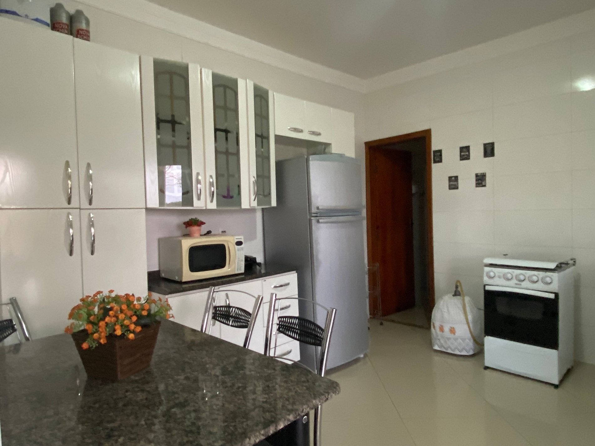 Cozinha equipada (2 fogões de 4 bocas, micro-ondas, geladeira, armários, utensílios básicos)