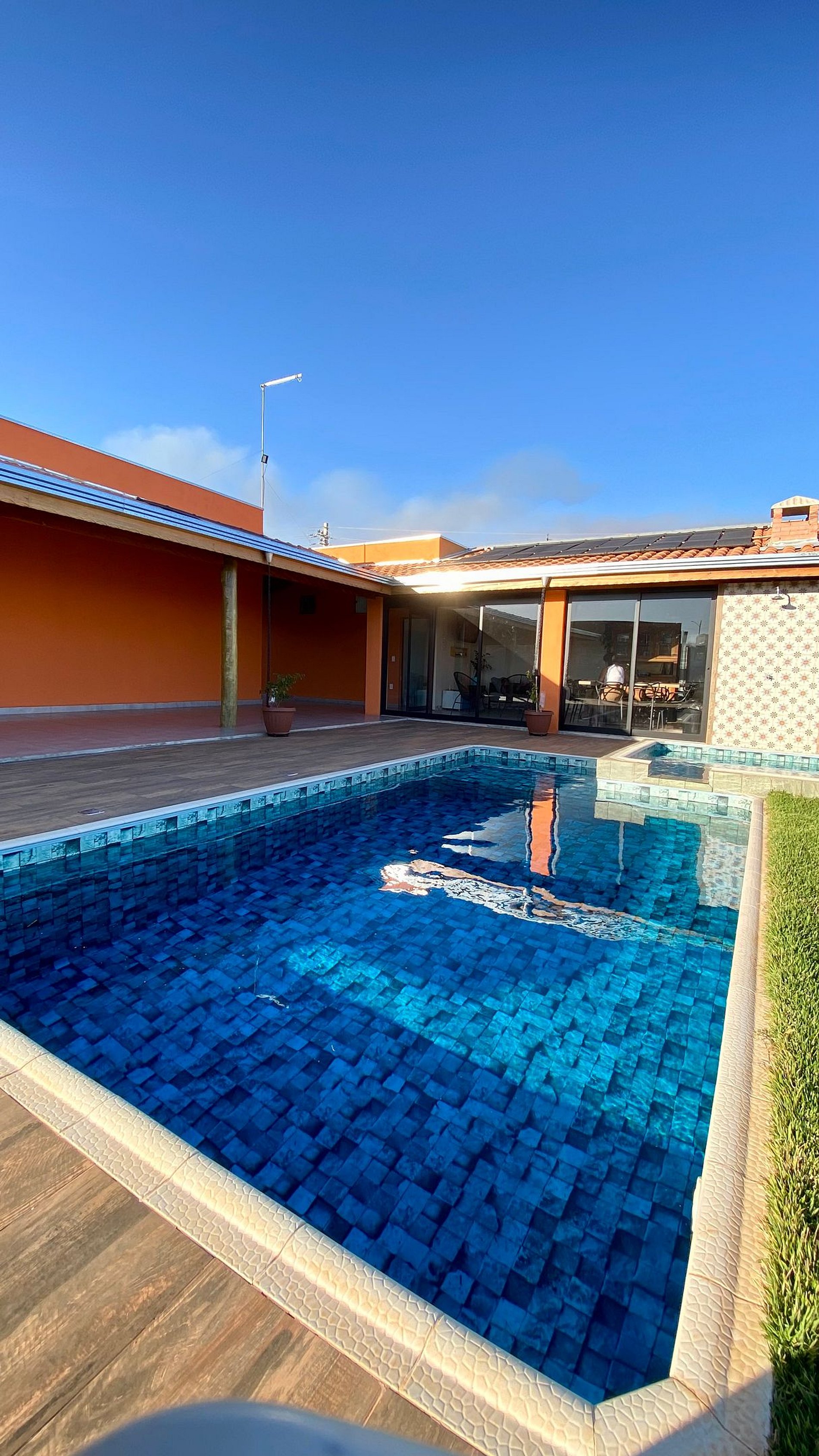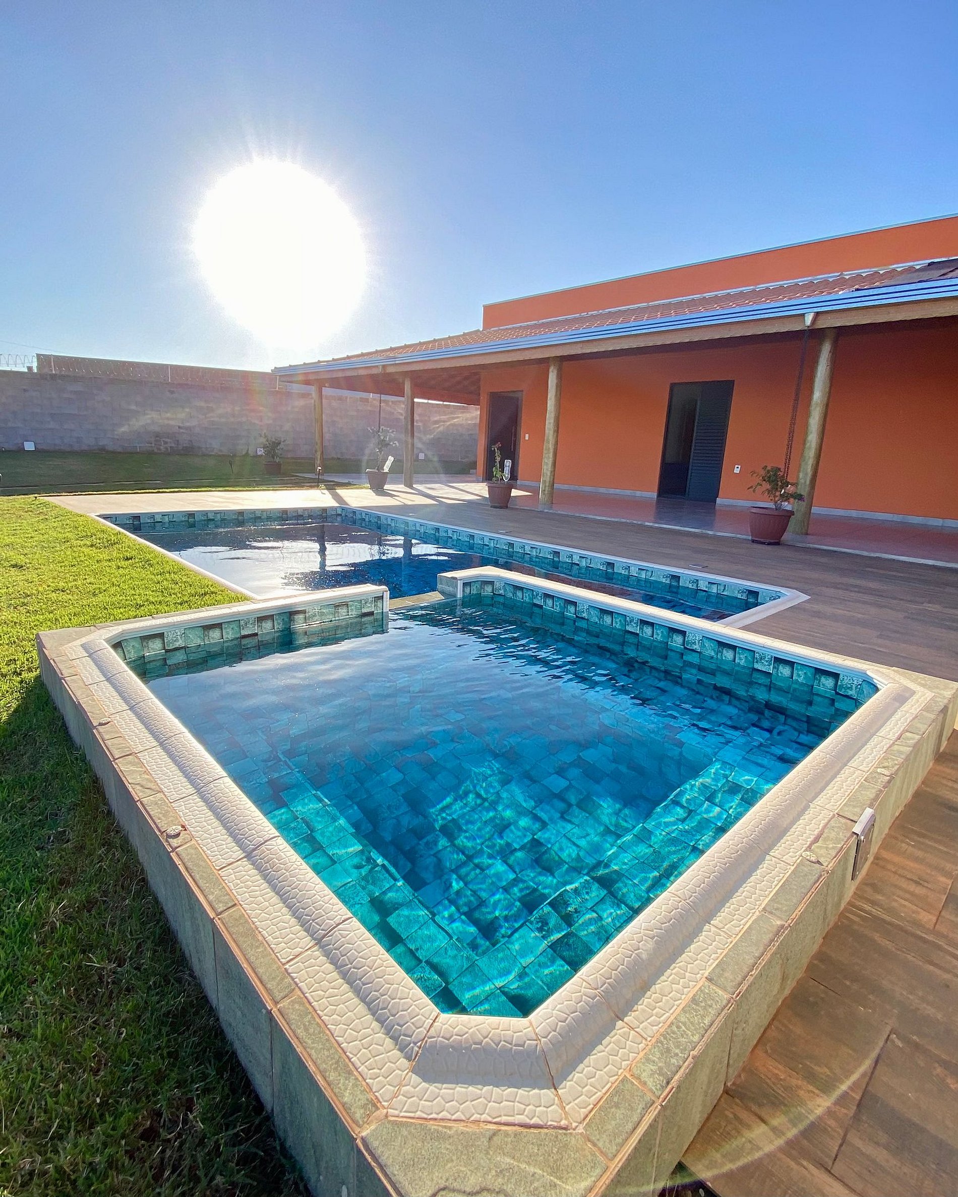 Piscina aquecida com parte rasa para crianças e área de hidromassagem