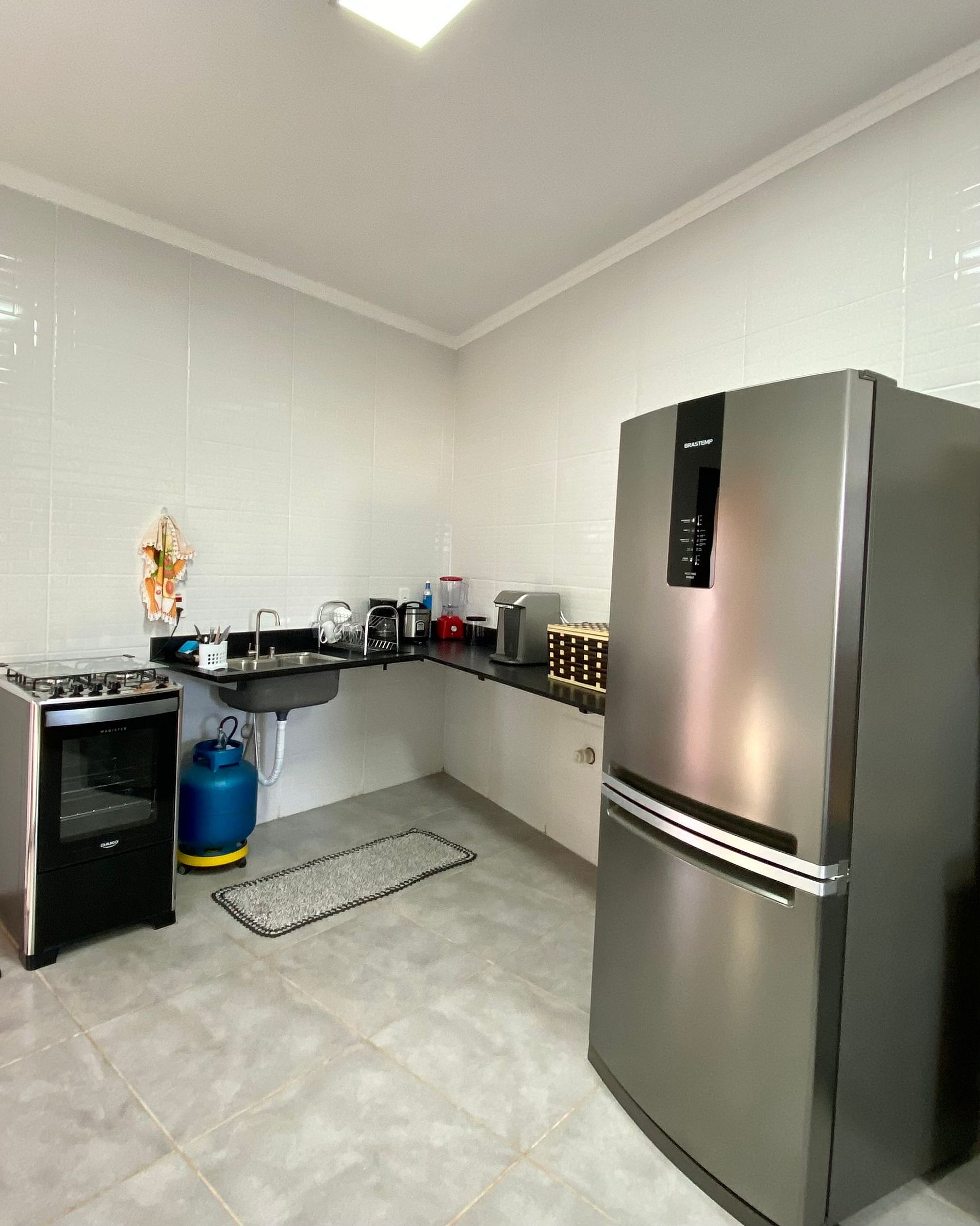 Cozinha interna equipada com fogão, geladeira e utensílios básicos