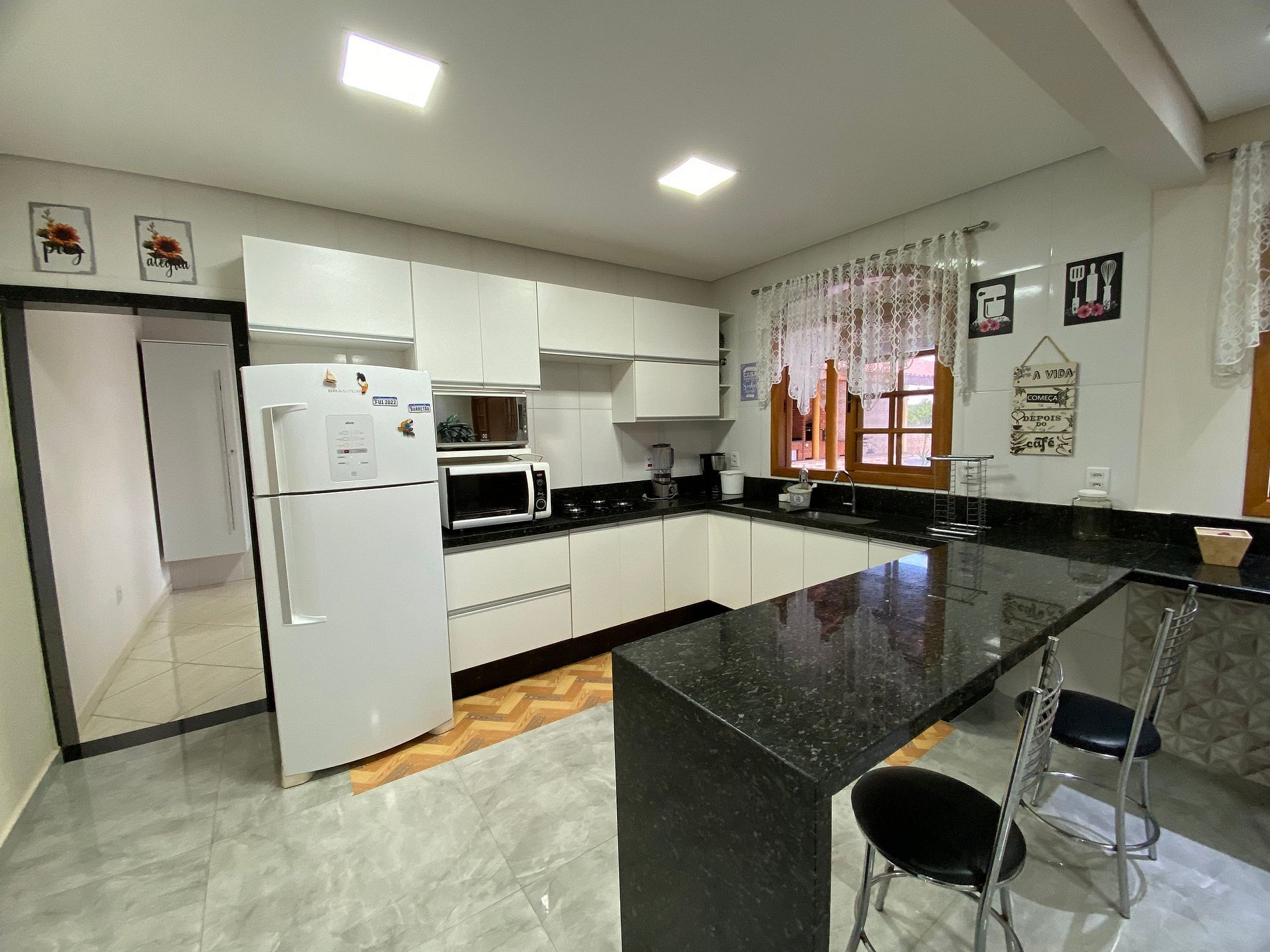Na cozinha planejada, você encontra tudo o que precisa: fogão, forno, micro-ondas, geladeira, congeladeira e utensílios básicos. Para maior praticidade, há também lavanderia com máquina de lavar roupas.